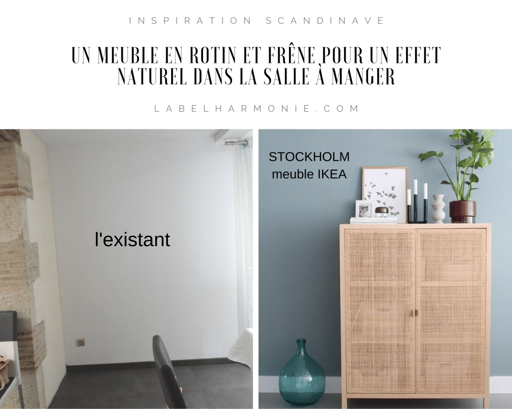 Côté salle à manger, la table en bois blond de 3 mètres de long, et ses chaises blanche et bois, de style scandinave, siègent au centre de la pièce. Contre le mur d’en face, un merveilleux meuble en rotin, très tendance. De petits cadres et une plante verte sont posés sur le dessus. De chaque côté des deux baies vitrées, on retrouve les voilages verts d’eau qu’affectionne Caroline. Dans le passage, direction le salon, un meuble « fait maison » composé de cagettes peintes en blanc, rehaussées par des pieds en bois blond, accueilles de nombreuses plantes vertes.