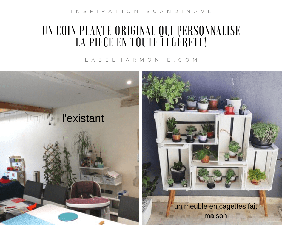 Dans le passage, direction le salon, un meuble « fait maison » composé de cagettes peintes en blanc, rehaussées par des pieds en bois blond, accueilles de nombreuses plantes vertes.