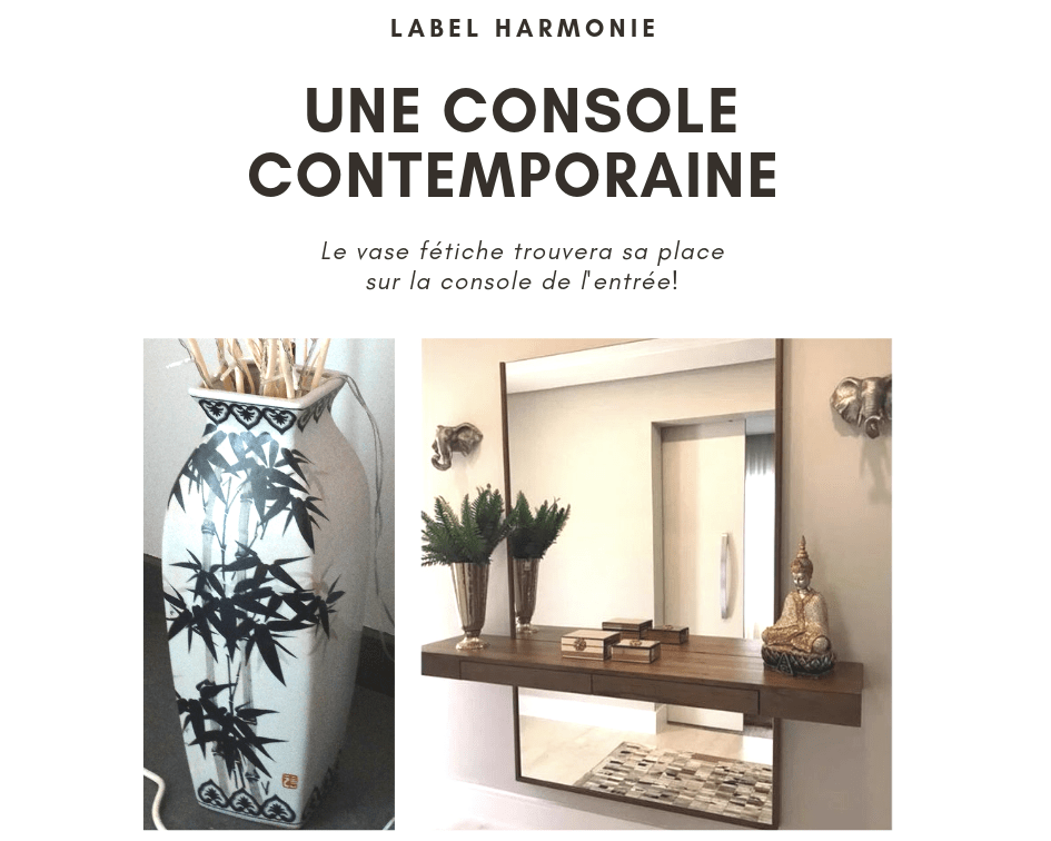 Un peu plus loin, toujours sur le mur de gauche, un gigantesque miroir surplombe la console en bois, fixé au mur. Le vase fétiche de Caroline est posé dessus ainsi que d’autres objets de décoration évoquant le style ZEN.