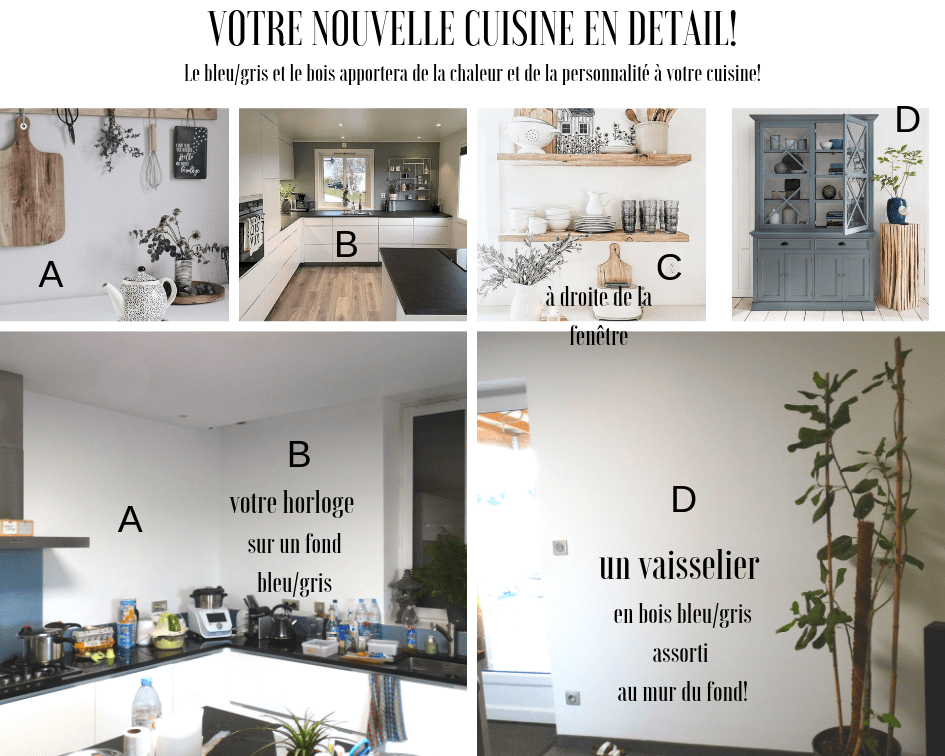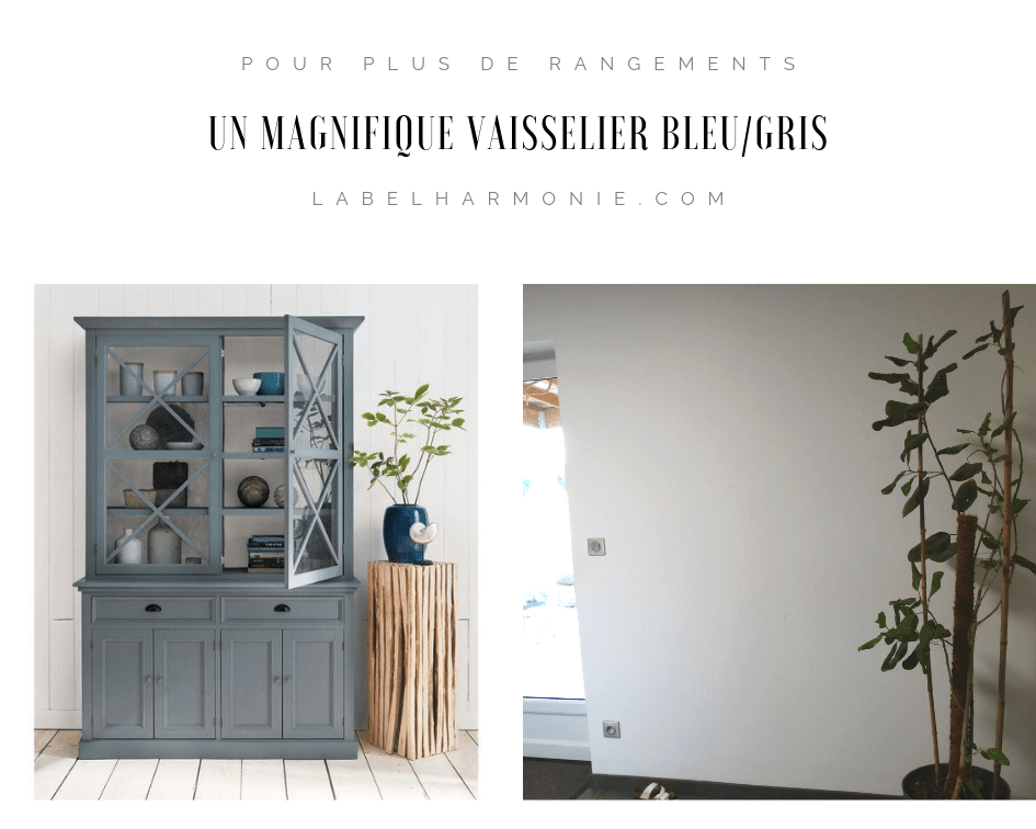 Un magnifique vaisselier en bois, peint dans le même bleu/gris que le mur du fond, vient habiller le mur de droite et fournir des rangements supplémentaires.