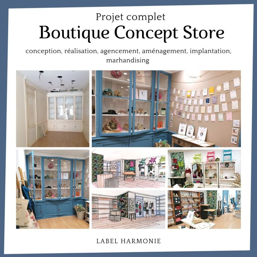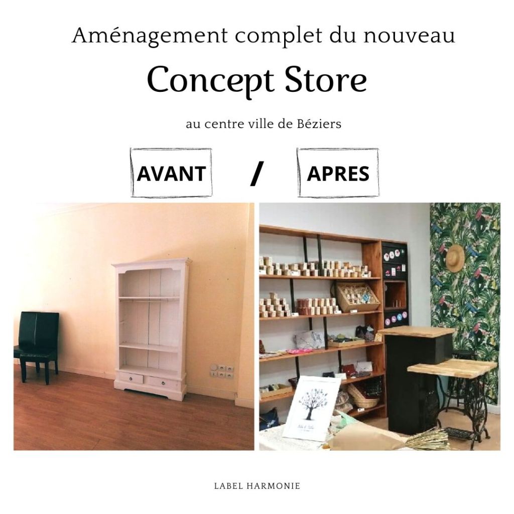 Pour donner du peps et de la personnalité à cette boutique de créateurs, je choisi un papier peint tropical qui habille deux petits murs, celui de la caisse et celui du coin des ateliers créateurs. Le magnifique mobilier réalisé à partir de meubles et objets de récupération détournés, permet de mélanger les styles tout en donnant une véritable identité à ce lieu..