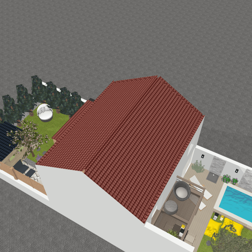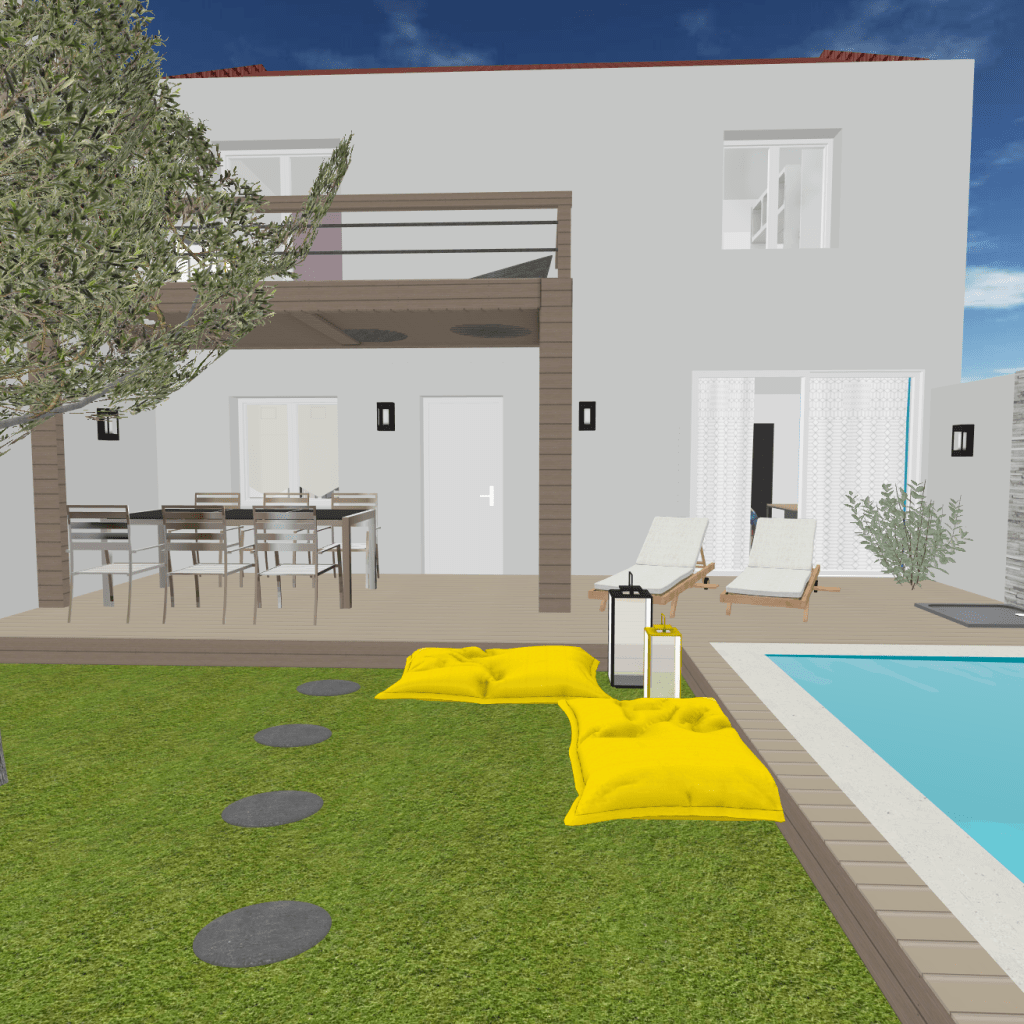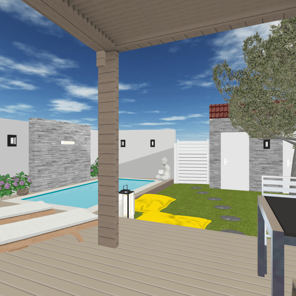 Pour cela, je propose de créer une grande terrasse en bois , un bassin, un jardin et une petite dépendance qui servira de buanderie, de débarras et de local technique.