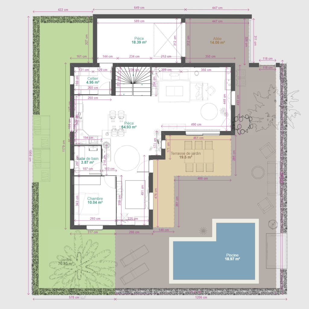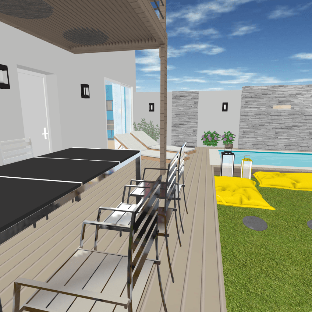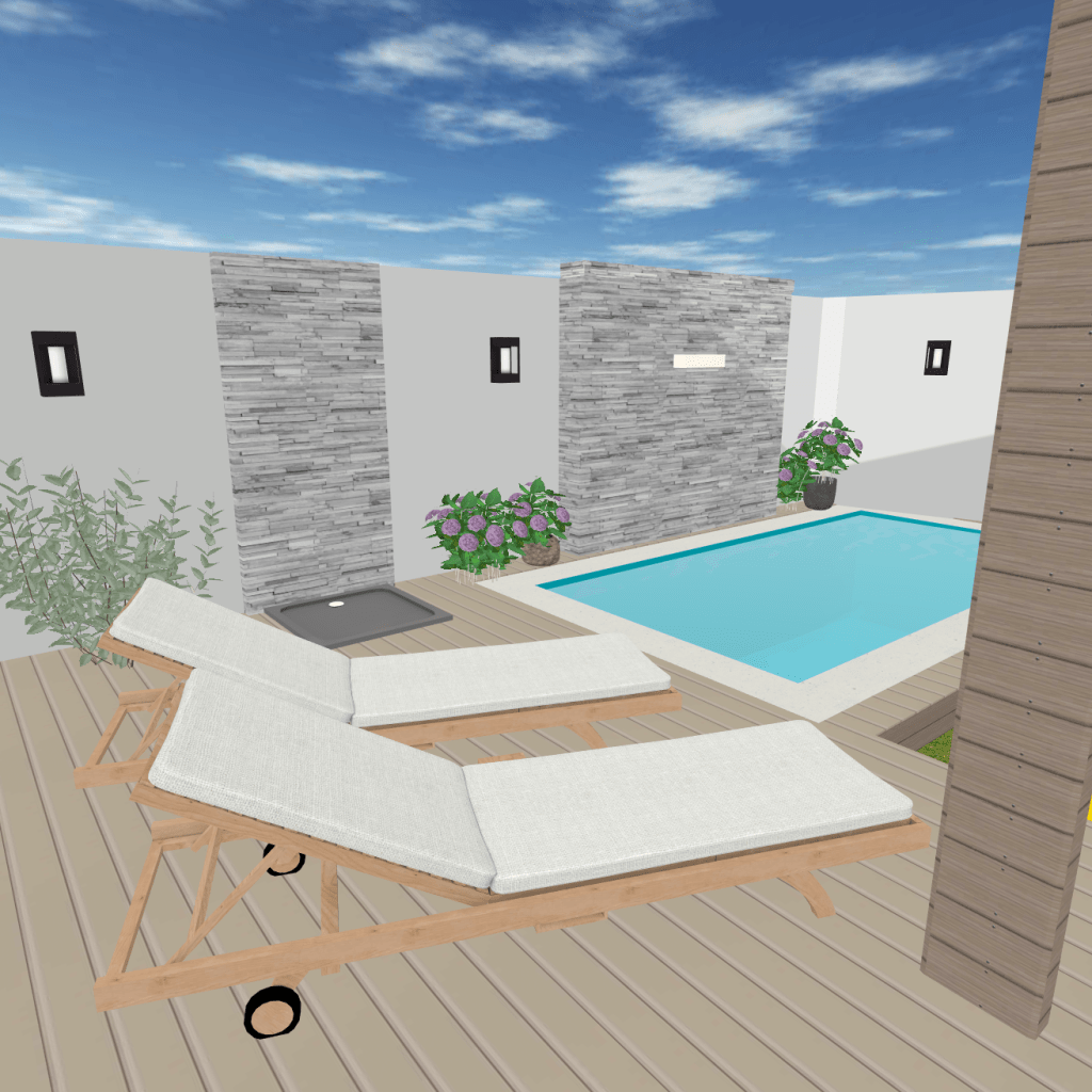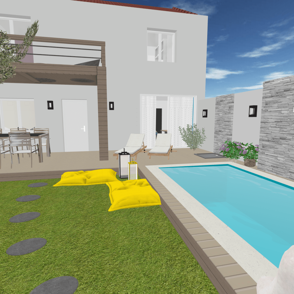 Pour cela, je propose de créer une grande terrasse en bois , un bassin, un jardin et une petite dépendance qui servira de buanderie, de débarras et de local technique.