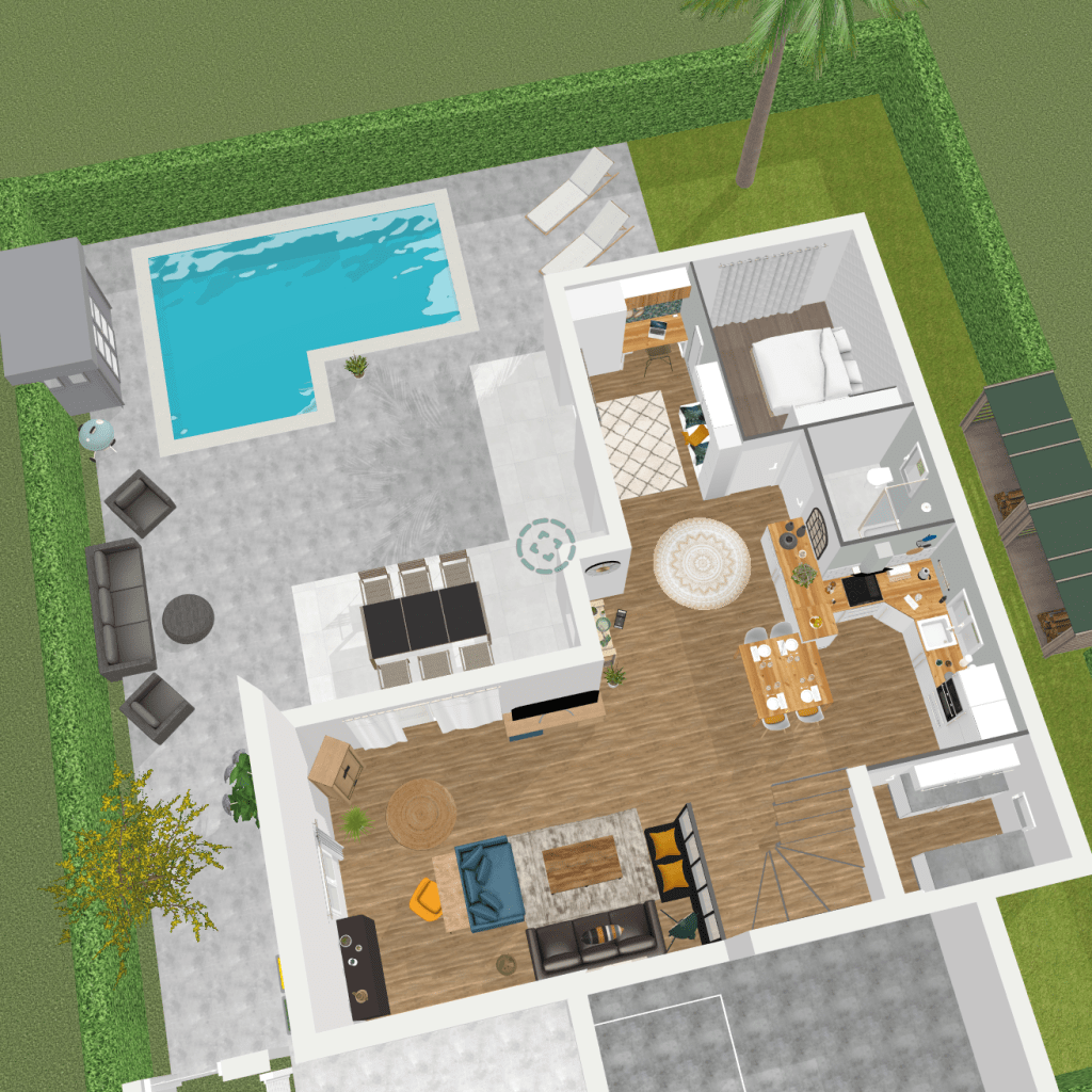 Plan 3D de l’ensemble du rez-de-chaussée ainsi que de l’extérieur