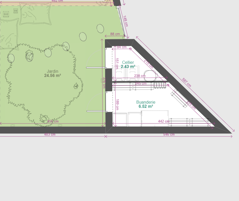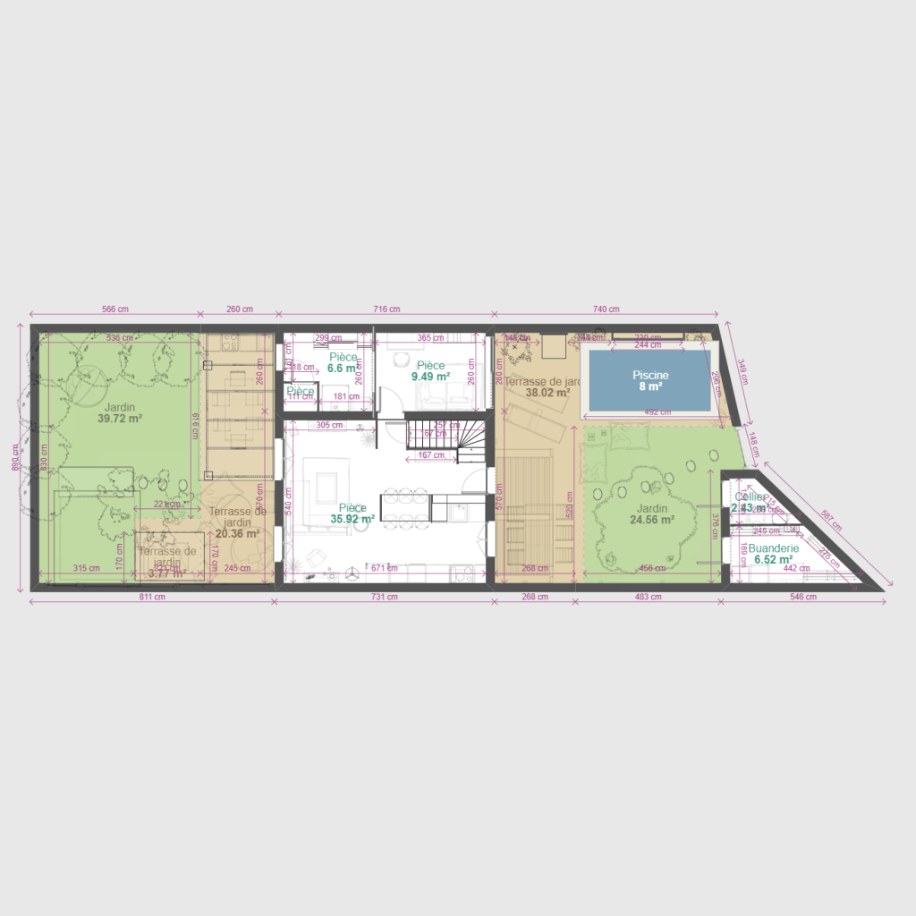 Plan 2D de l’ensemble du rez-de-chaussée ainsi que de l’extérieur